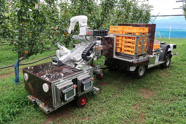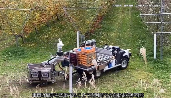 国立研究開発法人 農業・食品産業技術総合研究機構(農研機構)、立命館大学、株式会社デンソーは、リンゴやナシなどの果実9品目に対応した、自動走行車両付き収穫ロボットのプロトタイプを発表した。