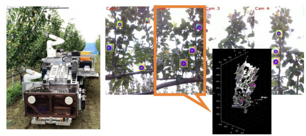 ロボットに搭載した4台のカメラそれぞれで果実をディープラーニングを用いて認識して判別する。RGB-Dカメラで距離を測ってロボットから対象までの距離を取得する。