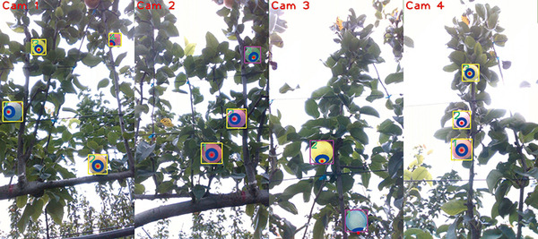 カメラが判別する実際の映像。□は認識に成功した果実。青と赤の◎は、ていあ部(果頂部、果実の尻の窪んだ部分)の果皮色から収穫適期を判断するためのていあ部の認識。Cam1~Cam4 の画像は、収穫ロボットに取り付けられた4台のカメラが同時に撮影したそれぞれの画像。1 つの画像中の果実の番号は、1 つのカメラが認識した果実の通し番号。(提供:立命館大学)