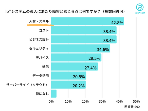 ソラコム主催のIoT技術を学ぶラーニングイベント「SORACOM Technology Camp」の参加者アンケートによると、IoTを始める際の障害と感じる点として「人材・スキル」が最も多く、4割以上の方が課題だと答えている。