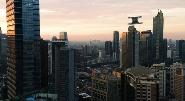 動画では、eVTOL機はドローンのように回転翼を4基搭載。ビルの屋上にあるポートを離陸した機体は街の上空をゆっくりと進み、別のビルの屋上のポートに着陸する。