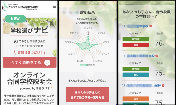 これらの結果、中学受験生を持つ多くの家庭は今、受験する学校や志望校の選定に苦労している。上記の悩みに応えるため、同社は「オンライン合同学校説明会」に掲載された私立中学校からの回答を解析・定量化し、子どもの性格に合った学校を簡単に選べるツールとして校風診断テスト「学校選びナビ」を開発した。