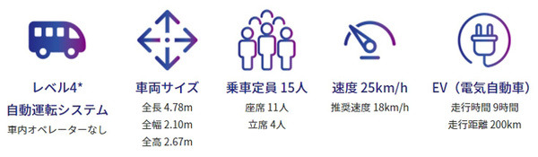 新型の「EVO」はレベル4に対応し、最大乗車定員15人、最高速度25km/h(推奨速度18km/h以下)のEV仕様。高精度の自動運転ソフトウェアや最先端のセンサー、技術を搭載した信頼性の高い自動運転ソリューションとなっている。