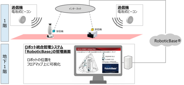 施設内に複数個設置するビーコンを用いることでロボットの種類を問わない汎用的手法で位置を把握するほか、統合的な管理画面上でロボットの位置を可視化。統合管理対象となるロボットは警備ロボット「SQ-2」(SEQSENSE社提供)と除菌ロボット「CLINABO CL02」(日本信号社提供)の2種で、ロボット提供各社との連携によって実証実験を実現する。