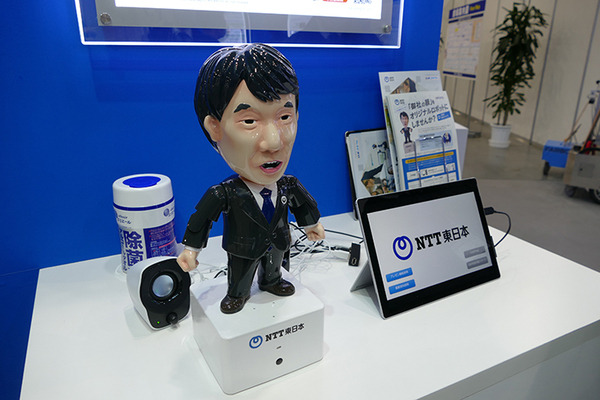 NTT東日本は、ヴイストンの「Sota」を使った、ロボットによるブース案内や検温ソリューションを出展。クラウド型ロボットプラットフォーム「ロボコネクト」を使って多言語案内やチャットが可能。また、Sotaを基盤として開発コストを下げつつオリジナルデザインのキャラクターを用いることもできる「オリジナルロボットソリューション」もアピールしていた。音声はNTTメディアインテリジェンス研究所によるディープニューラルネットワークを活用した音声合成技術「FutureVoice Crayon」を使うことで人間の声と遜色ない声を合成できるという。製作に必要な最短期間は約三ヶ月。