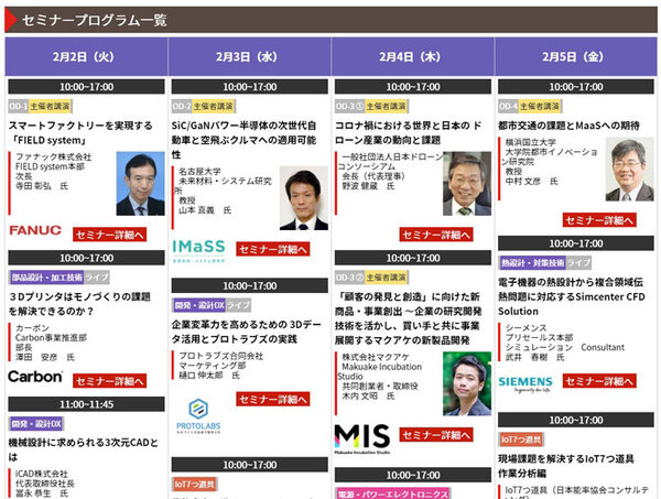 豊田中央研究所、NVIDIA、ファナック、日本マイクロソフト、ソニー、マクアケなどが登壇する約30もの講演が毎日予定されている(無料:講演の視聴には登録が必要)。
