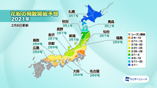 株式会社ウェザーニューズは、花粉観測機「ポールンロボ」で基準を超える花粉が観測されたことやユーザーからの症状報告を総合して、関東南部から九州の1都16県が2月7日までに花粉シーズンに突入したことを発表した。