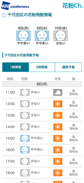 コロナ禍の花粉対策に、1時間ごとの花粉の飛散量と飛散予報をウェザーニューズがアプリで無料公開中だ。