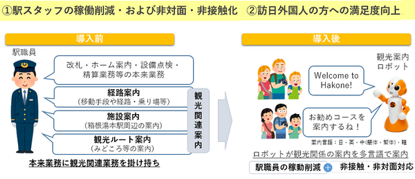 小田急とNTT東日本とは、2019年3月から5月に「多言語対応ロボットを活用した観光案内・施設案内における実証実験」を連携して行っており、その経緯も踏まえ今回のサービス開始に至った。両社は、同サービス提供により「利用者との非対面・非接触化」が実現することで、より安全・安心な箱根周遊を提供できるようになると述べている。