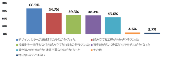 続いて、4年以上前からプラモデル作りに取り組んでいる人と、ここ3年以内にプラモデル作りを再開した人(349名)に対し調査を実施。昔のプラモデルと現在のプラモデルの違いで感じたことを伺うと、「デザイン、カラーが洗練されたものが多くなった(66.5%)」が最も多くなり、次いで「組み立てる工程が分かりやすくなった(54.7%)」、「接着剤を一切使わなくとも組み立てられるものが多くなった(49.3%)」がトップ3に。デザイン面のアップデートに加え、作業工程の簡略化を新旧の違いとして感じている方が多い結果となった。