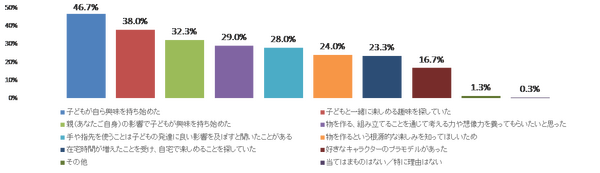 続いて、子どもと一緒にプラモデル作りに取り組んでいる人(300名)に対し調査を実施。子どもとプラモデル作りを始めたきっかけを伺うと、「子どもが自ら興味を持ち始めた(46.7%)」が最も多くなる結果に。その他、「物を作る、組み立てることを通じて考える力や創造力を養ってもらいたいと思った(29.0%)」、「手や指先を使うことは子どもの発達に良い影響を及ぼすと聞いたことがある(28.0%)」にも回答が集まる結果であった。