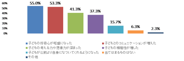 さらに、子どもとプラモデル作りを始めたことによる変化の有無を伺うと、「子どもの好奇心が旺盛になった(55.0%)」が最も多くなり、次いで、「子どもとのコミュニケーションが増えた(50.0%)」、「子どもの考える力や想像力が深まった(41.3%)」との回答だった。