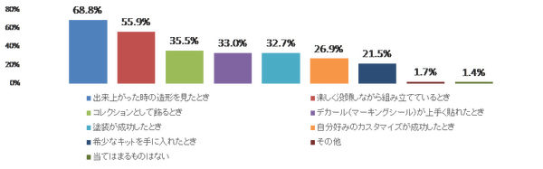 次に、プラモデルを買って良かったと思う瞬間についての問いには、「出来上がった時の造形を見たとき(68.8%)」に次いで、「楽しく没頭しながら組み立てているとき(55.9%)」との回答だった。
