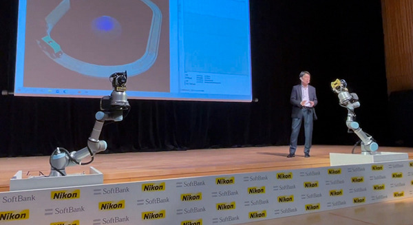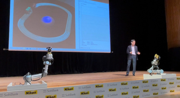 ソフトバンクとニコンは、光無線通信技術を連携して研究・開発していくことを発表した。それに伴って3月18日、2台のロボットがランダムに動いても双方向で追尾してトラッキングするビジュアル・サーボ技術(ロボティクス・ジンバル)を開発し、報道陣にデモを公開した。トラッキングにはAI画像認識技術が使われている。