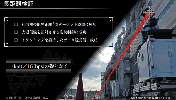 実証実験には成功したものの、実用化にはまだ多くのステップを踏むことが必要、それは今回登壇したソフトバンクとニコン両社とも感じている認識のようだ。例えば、今回のデモでは数mの距離で行われたが、実験ではそのとき使用していた通信機の限界距離にあたる100mでも行われ、それに成功しているという。どれだけ長距離でどれだけ高速に通信が可能か、などブラッシュアップしていく必要がある。