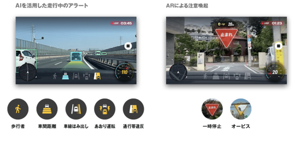 『AiRCAM』(エアカム)は交通事故や交通違反の削減を目的として開発されたドライブレコーダーアプリ。走行中は映像や走行データの記録とともに、AIによるリアルタイムの画像解析で、危険や交通違反につながる運転に対して注意喚起をし、安全運転を支援する。また、見落としがちな一時停止やオービス設置場所では、ARを活用した直観的な注意喚起で交通違反や速度超過を抑制する。
