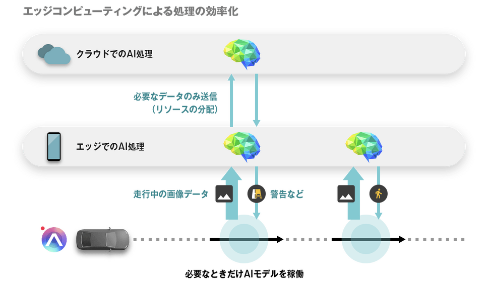AIによるリアルタイムの画像解析においてはエッジ(スマートフォンアプリ側)とクラウドでの分散型AIシステムを構築し、アプリでの高度なAI処理を実現している。これにより、刻々と変わる実際の運転状況にあわせて、瞬時に、的確に、様々な警告を発することができる。また、アプリのアップデートをしなくても、常に学習し続けるAIをいつでも最新の状態で利用可能。
