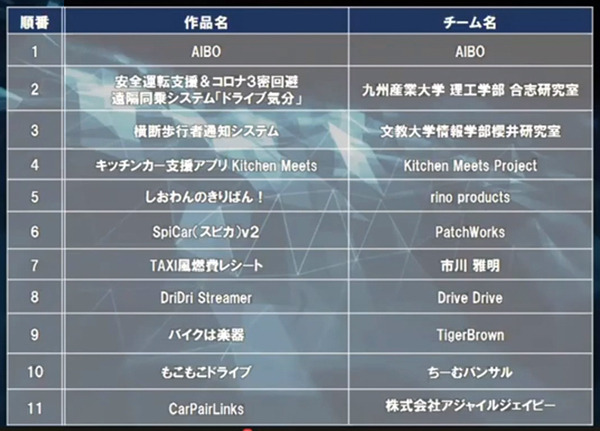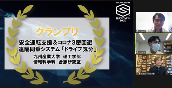 審査の結果、九州産業大学 理工学部 情報科学科 合志研究室(ごうしけんきゅうしつ)の「安全運転支援&コロナ3密回避 遠隔同乗システム”ドライブ気分”」がグランプリに輝いた。賞金50万円とiPad Proが授与された。