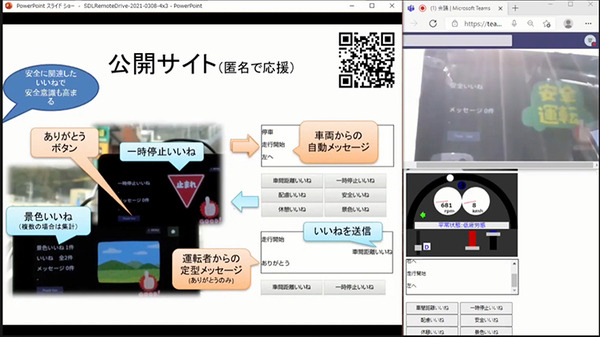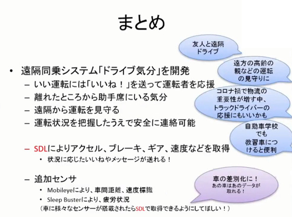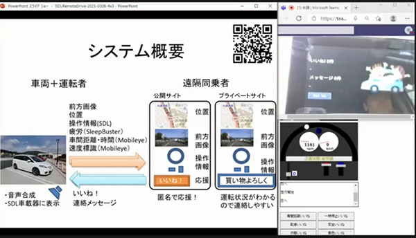 開発した合志研究室はユースケースについて問われると「コロナ禍でなかなか一緒にドライブにもいけない状況なので、遠隔から同乗してドライブを楽しもうとか、高齢の父母の運転が心配なので遠隔から同乗して見守ろうとか、コロナ禍で物流の仕事が大変になっているので長距離輸送のドライバーを応援したり、自動車教習所などで利用されるようになったらいいなと思います」と回答した。