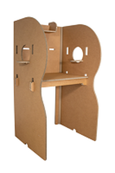 軽量、頑丈、耐水、壁厚をもたらす最強の強化段ボール製。厚さ5cmから組み立て1分で机に変形、その日の気分でスタンディングポジションも選択可能。幅75cmミニマルサイズで自宅のどこでも集中できる。4月3日(土)展示開始。
