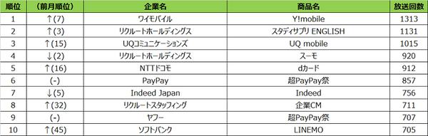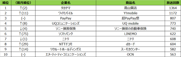 同調査によると、3月度のランキングでは、商品別・エリア別ともに、大手携帯キャリア3社と格安SIM・スマホ取り扱い企業の出稿が目立った。また、商品別ランキング1位はワイモバイル「Y!mobile」となり、放送回数は2位よりも約2000回上回る6429回であった。