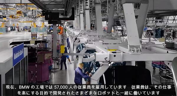 BMWの工場では5万7千人が就業し、その仕事を効率的で楽なものにするために様々なロボットと一緒に働いている、と説明。