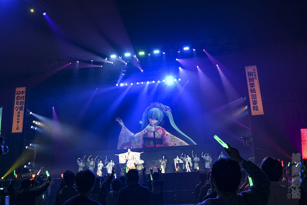 頼光主従に襲いかかる蜘蛛との立ち廻りは、これまた歌舞伎らしさが詰まった場面。和紙でできた蜘蛛の糸「千筋の糸」が紙テープのように舞台にパッと散る様は見事だ。巨大蜘蛛に対峙し、頼光が幾重にも絡まる糸の中心で決死の立廻りを見せる場面は、手に汗握る凄まじさ。ラスボス感あふれる初音ミクに観客は大興奮だ。苦戦する頼光が「さぁニコニコユーザーよ、数多(あまた)の人の言の葉と白き炎(ほむら)を」と呼びかけると、観客は即座に白いペンライトを灯し、画面もユーザーが打ち込む白一色に。化生の執心が鎮められて七綾太夫は吉祥天女に昇華し、平和が訪れた。