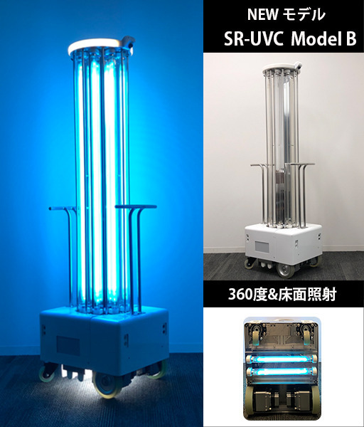 2020年秋に販売を開始した紫外線照射ロボット「SR-UVC」は紫外線「UV-C波長 254nm照射ランプ」を搭載したロボット。紫外線UV-Cは、古くから医療現場等でも除菌目的で使用されてきたもので、同社のロボットは遠隔操作型の自走式ロボット。