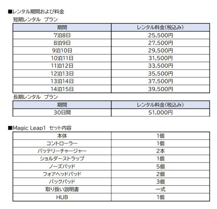 レンタル料金は7泊8日が25,500円(税込)、14泊15日は39,500円(税込)、30日の場合、51,000円(税込)。レンタルでは「Magic Leap 1」本体の他、コントローラー、バッテリーチャージャー、ノーズパッド、取扱説明書などの一式が付属する。