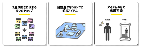 「VketMall」はエントランスホールを中心にセレクトショップと複数のコミュニケーションスペースを設けられる。セレクトショップ内には常時約100種類のアイテムが展示・出品され、2週間を1区切りとしてアイテムが全て入れ替わる。今回のプレオープンでは、前半1週間で10種類、後半1週間で10種類の、計20種類のセレクトショップを展開する。