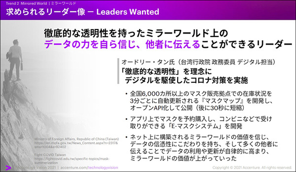 「ミラーワールド」の理想のリーダー像としてオードリー・タン氏をあげた。