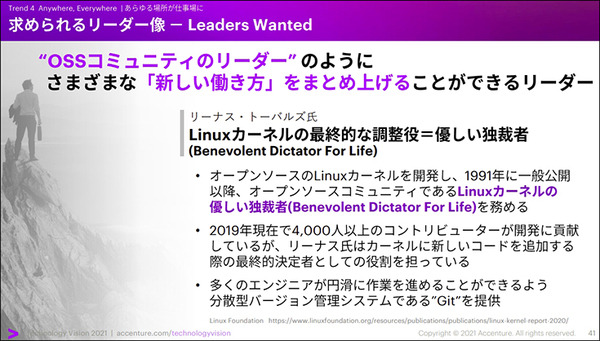 理想のリーダー像として、Linuxカーネルを開発し、一般公開したことで知られるリーナス・トーバルズ氏を挙げた。