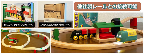 他社製品の木製レールおもちゃ「BRIO」(ブリオ)等のレールをつなげて使用することができる。実際に使用した写真の製品は「BRIO クラシックDXレールセット」と「IKEA LILLABO 列車レール 50点セット」。レールを拡張し、複数のカラーシールを活用することで、より複雑な動きを実現できる。