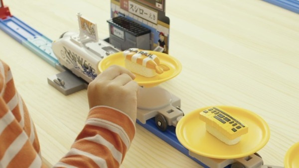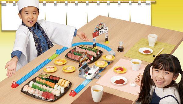 「極み!おとどけ!スシロー×プラレール」は「プラレール」を使用したおすしのお届け遊びを誰でも簡単に楽しむことができるオールインワンセット。専用列車「すし特急おまち」のほか、お皿、お皿を載せる専用の貨車、オリジナルデザインのプラレールすし4種類が付属し、おすし屋さんごっこが楽しめるほか、本物のおすしを乗せて走行させることもできる。なお、本物の食品を乗せて楽しむ商品は「プラレール」としては初。