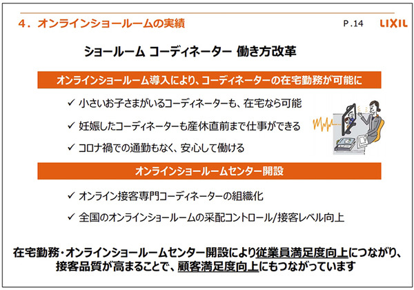 キッチン、トイレ、浴室などの水まわり製品や、窓、ドア、インテリア、エクステリアなどの建材製品を開発、提供している株式会社LIXIL(リクシル)は、ショールームコーディネーターとZoomなどのネットを使って相談できる「LIXILオンラインショールーム」を積極的に展開している。この1年間で累計14,000組以上のユーザーに利用されるに至った。(この記事の末尾で「錦織圭選手がLIXILオンラインショールームを体験」した動画も紹介)