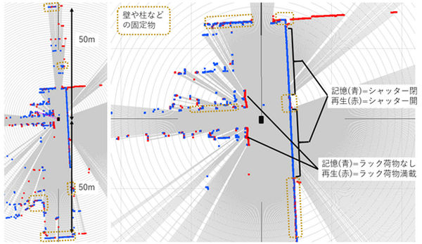 同検証では、サウザーに標準搭載されたLiDARの他に、高い位置に追加搭載されたLiDAR(冒頭の画像)を用い、建物内で環境変化が少ない領域(地上3m等、サウザーの周囲で可動する台車や床置きパレット・荷物の影響を受けない高い位置)を優先的にセンシングすることで、環境変化に負けない自動走行を実現。サウザーEシリーズに対して最長200mまで計測可能な3D-LiDARを追加搭載した。また、メモリトレースの環境認識アルゴリズムにも改良を加え、モノ移動が多く環境変化が激しい物流倉庫においても安定して走行できる要素技術を開発。具体的には、倉庫内の荷物や環境条件に変化が生じた場合であっても、センシングした3D形状のデータから、可動物品と固定物とを厳密に見極め、壁や柱や棚などの固定物形状を特徴点として正確に抽出できるアルゴリズムを搭載した。