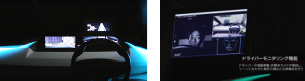 「ドライバーモニター付きコックピット」は視線認識技術でクルマと人をつなぐ技術。ヘッドアップディスプレイをドライバーの目線に合わせて最適な高さに自動調整。複数あるディスプレイの中でドライバーが見ているディスプレイのみを明るくする機能、脇見をしていたら注意を促す機能など、メーターに埋め込まれたカメラによって視線を認識し、快適で安全なドライブをサポートする。