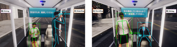 「見守りシステム」は自動運転シェアリングカーなどの運転手がいない車内において、乗客の骨格をカメラで認識し、AIが判定することでシーンに応じたサービスを提供する。例えば、乗客が立っているのか座っているのかを認識し、転倒防止のため、立っている時は車を発車させず、着席を促す。また人とモノを結び付け、所有者を判別できるため、忘れ物を検知し所有者に伝えることも可能。この技術は電車やバスなどのモビリティ、老人介護施設や病院、学校など人が多く集まる場所でのトラブル防止や、「密」な場所を監視するなど様々な場面での活用も検討しているという。