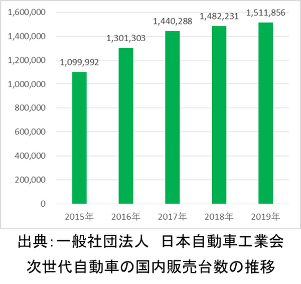 環境配慮への意識の高まりから注目度が高い電動車は、国内販売台数も右肩上がりで増えている。政府が発表した「2050年カーボンニュートラルに伴うグリーン成長戦略」では、2030年半ばまでに乗用車新車販売で電動車100%の実現を目指す旨が明記され、電動車の注目度及び普及率はますます上がっていくことが予想されている。
