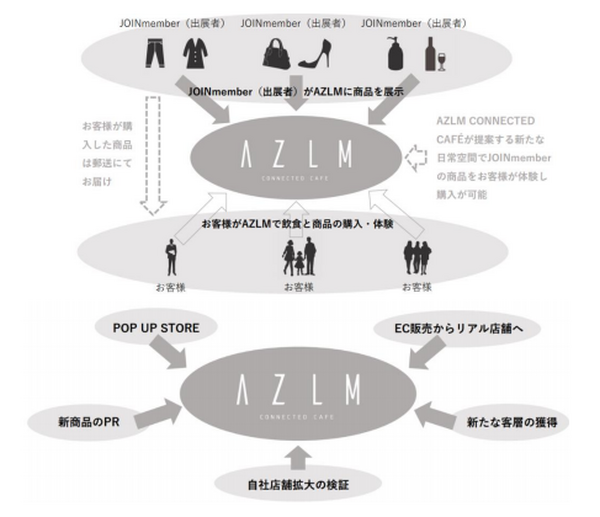 「AZLM」は「From A to Z , Live Marketing」の頭文字を引用し、あらゆる商品をライブでマーケティングできる未来型のCaféを意味している。渋谷地下街店では約300点の展示スペースに地方に眠る良いモノ・コト・ヒトをディスプレイし、来店するユーザーに見て、触って、試してもらえる機会を提供する。これらの出展者を「JOIN member」と呼び、AZLMのシステムにJOIN=参加する、加わる、交わることで、これらの魅力を感じて、共感してもらえる場所として利用してほしいと考えている。