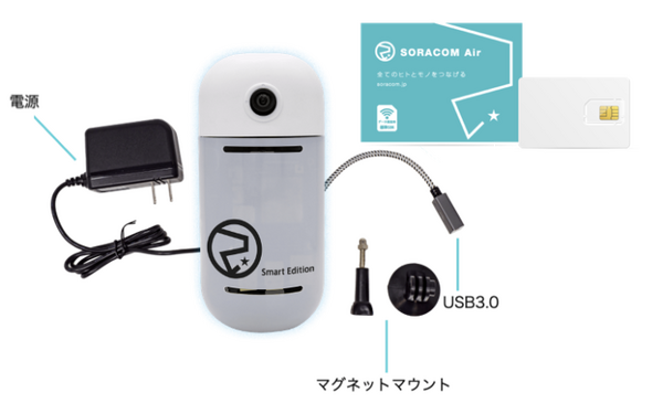 セット内容本体、ACアダプタ、汎用型マグネットマウント、SORACOM 特定地域向け IoT SIMカード plan-D サイズ:マイクロ(データ通信のみ)