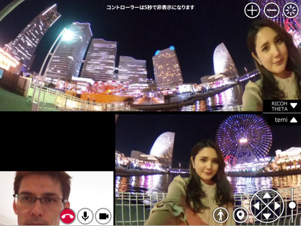 なおRICOH THETAとtemiの画面比率は、画面右中央のRICOH THETAもしくはtemiをクリックすることで、変化させることができるため、その時々に応じて遠隔コミュニケーションと360度映像どちらも楽しめるようになっている。