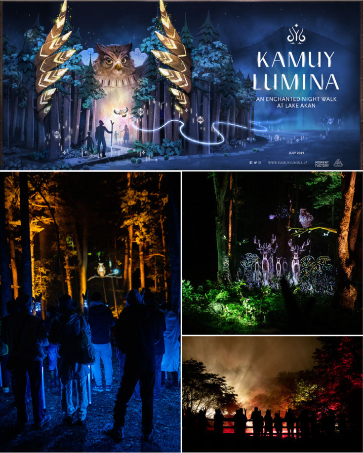 「阿寒湖の森ナイトウォーク KAMUY LUMINA」(以下、カムイルミナ)はプロジェクションマッピングやシノグラフィー(光と音の舞台装置)など最新鋭のデジタル技術で様々な演出や仕掛けがちりばめられた幻想的な夜の森1.2キロの遊歩道を散策しながら、”自然との共生”の大切さを伝えるアイヌの物語を追体験する新感覚の体験型観光コンテンツ。大人も子どもも登場人物の一員となって物語に参加し、アイヌ文化の世界観や阿寒湖の自然美を五感で体感することができる。