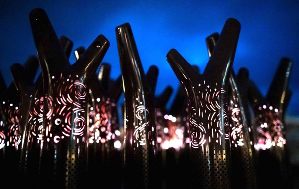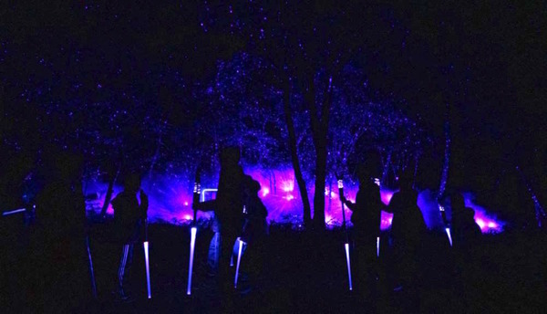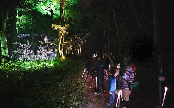 この旅のガイド役であり冒険のキーアイテムとなるのが、伝統的なアイヌの杖をモチーフに作られた「リズムスティック」。森の入り口で来場者に1本ずつ手渡され、これを頼りに真っ暗な夜の森を歩いていく。リズムスティックには杖としての役割と共に、ストーリー展開と連動したインタラクティブな仕掛けも施されている。あるシーンではリズムスティックからナレーションや音楽が流れたり、色鮮やかに点灯したり・・・。また、フクロウやカケスなどのキャラクターたちとともに参加者自身も登場人物の一員となって、物語の世界に飛び込んだような没入感も満載!