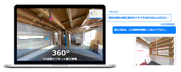 具体的には、現場監督はiPadなどのタブレットで現場を高精度に再現した360度VR空間にログインし、施工の確認や進捗管理を行い、課題や問題点をマーキングしたり、文字入力する。特定の担当者に向けた指示も行える。現場では施工担当者がスマートフォンやタブレット等でその指示を確認したり、施工担当者から監督や他の担当者宛に質問や確認事項をやりとりすることができる。これらの情報は関係者全員がフラットに共有することができる。