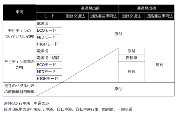 これまで「ペダル付きの原動機付自転車」は原動機を作動させずペダル走行させる場合であっても、原動機付自転車の属性は変化せず、例えば原動機付自転車が運転可能な場所(通行区分)や運転方法に従うこととなっていた。今回の改正(解釈変更)により、モビチェン機構を取り付けたハイブリッドバイクGFRは、モビチェンの操作により、原動機を作動させずペダル走行させる場合は道路交通法上自転車となり、自転車が通行可能な場所(通行区分)や運転方法に従うことになる。規制のサンドボックス制度を利用し、モビリティ分野で道路交通法の解釈変更が認められ、実際に運用が始まる。こうした取扱いとなる、日本で初の車体。