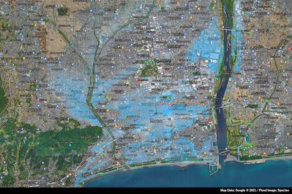 防災テックベンチャーの株式会社Spectee(以下、スペクティ)は2021年7月3日に神奈川県平塚市で発生した河川の氾濫による周辺の浸水状況について、AIでリアルタイムに解析し地図上にシミュレーションを行ったことを発表した。