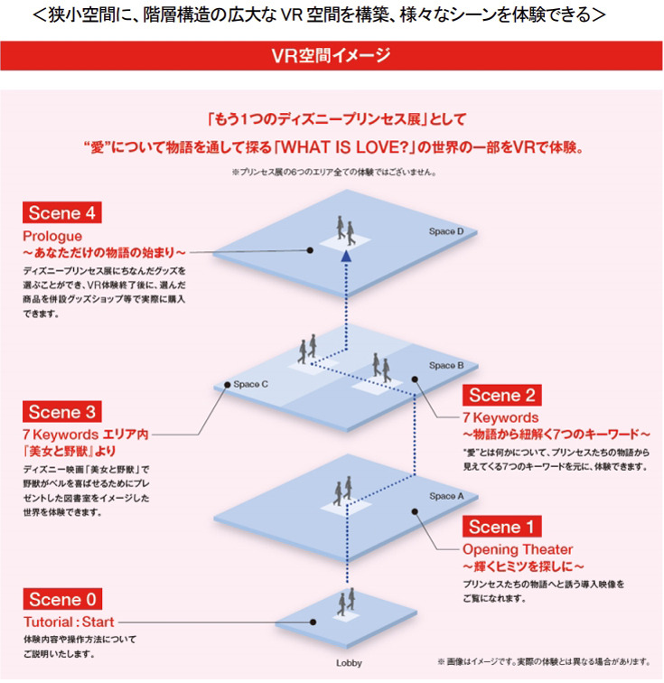 「ディズニープリンセス展VR」は、VR技術によって複数フロアと奥行きのある広大なVR空間を構築し、VRゴーグルを装着した複数人のユーザが等身大のアバターを通じて、それぞれ異なる体験ができるコンテンツとなっている。VR空間内ではアバター同士のコミュニケーション、ショッピング体験も可能。