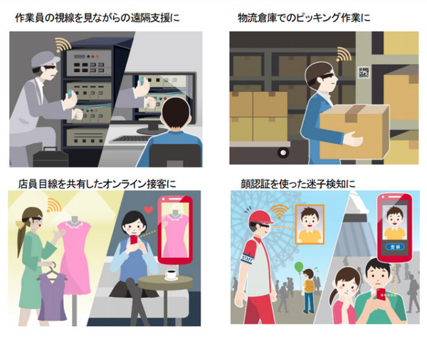 ドコモの5Gネットワークと「GlassEnterprise Edition 2」に対応したソリューションを組み合わせて利用することで、たとえば製造業やフィールドサービスでは遠隔地の映像を見ながら効率的に作業指示を出したり、物流業界では作業手順(ワークフロー)を閲覧しながら正確に作業を行うことが可能となる。また、スタイリッシュかつ軽量な特徴を活かし、ビデオチャットを通じたオンライン接客やオンラインレッスンでの活用など、業界問わず幅広い法人で利用することができる。