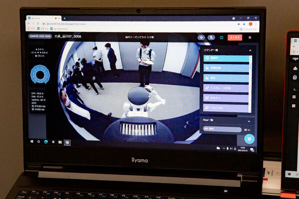 「ugo TSシリーズ」の最大の特徴は遠隔操作と自律操作をバランスよくハイブリッドで組み合わせているところ。頭上高く設置された俯瞰カメラで遠隔操作することができ、ルート巡回などは場所を指示するだけでugoは自動で移動することができる。